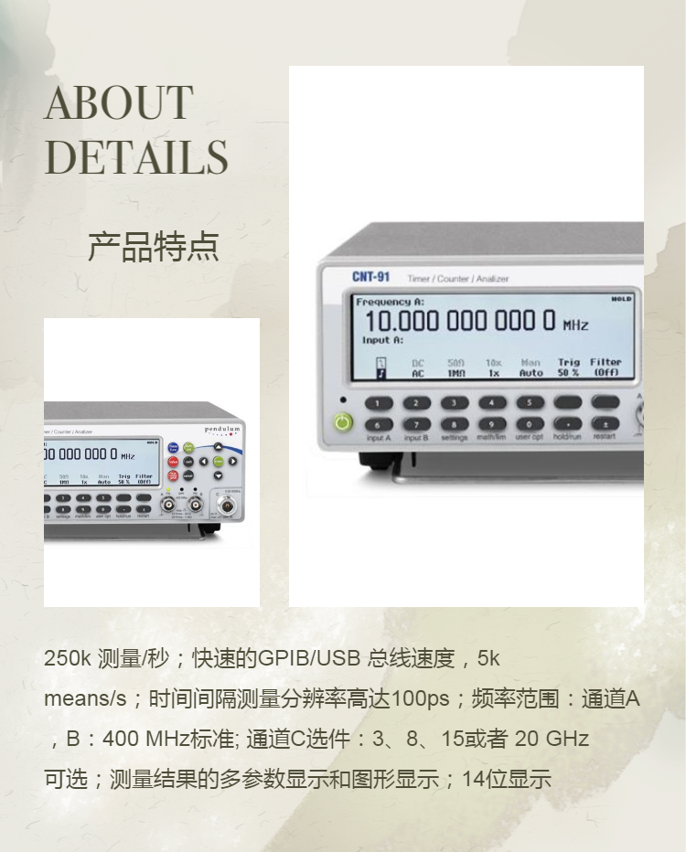 频率计数器/时间间隔测试仪/分析仪非常适合频率、时间或相位的测量、分析和校准。在生产测试系统,研发,校准实验室或者现场应用的场合,CNT-90 频率计数器/时间间隔测试仪/分析仪的性能优于市场上许多其它仪器。